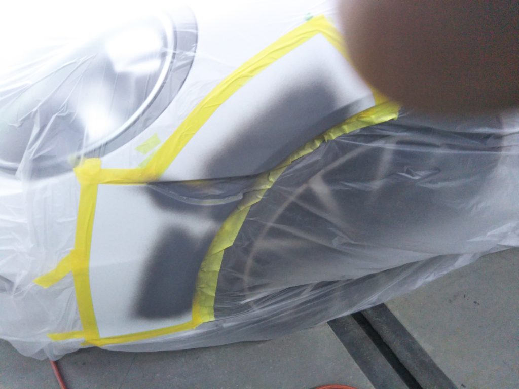 凹みを整形した後、パテを使って鈑金作業で僅かに残った凹凸を平らにする作業をしてから、サンディングした部分も含めてサフェーサーを塗装します。
