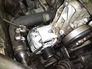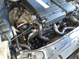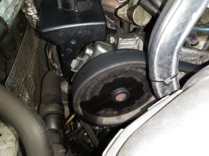 ファンベルトと古いパワーステアリングポンプを外し漏れたフルードをきれいに清掃。