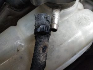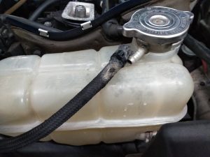 今回の車両でのクーラント漏れはオーバーフローホースからの漏れが主原因。