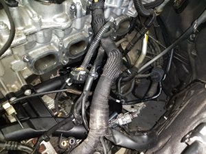 組み付け後エンジンクーラントを充填してエア抜きを行います。