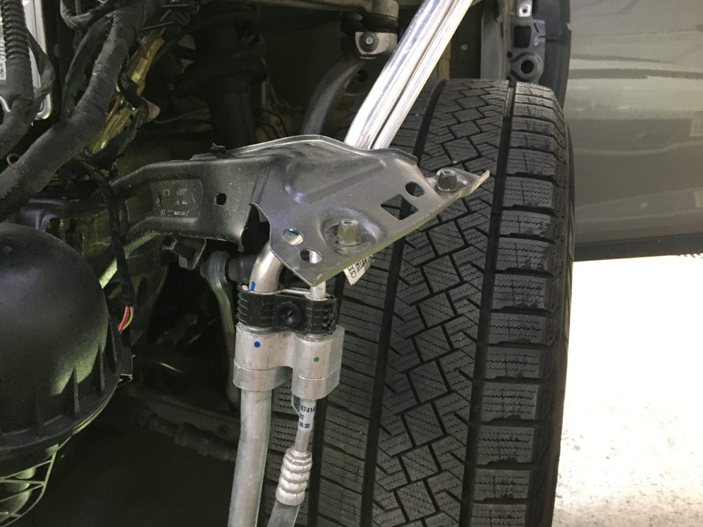 フロントフェンダーを外してみると、フェンダーを止めるステーやエアコンのパイプを中間部分を固定するステーなどが変形していました。