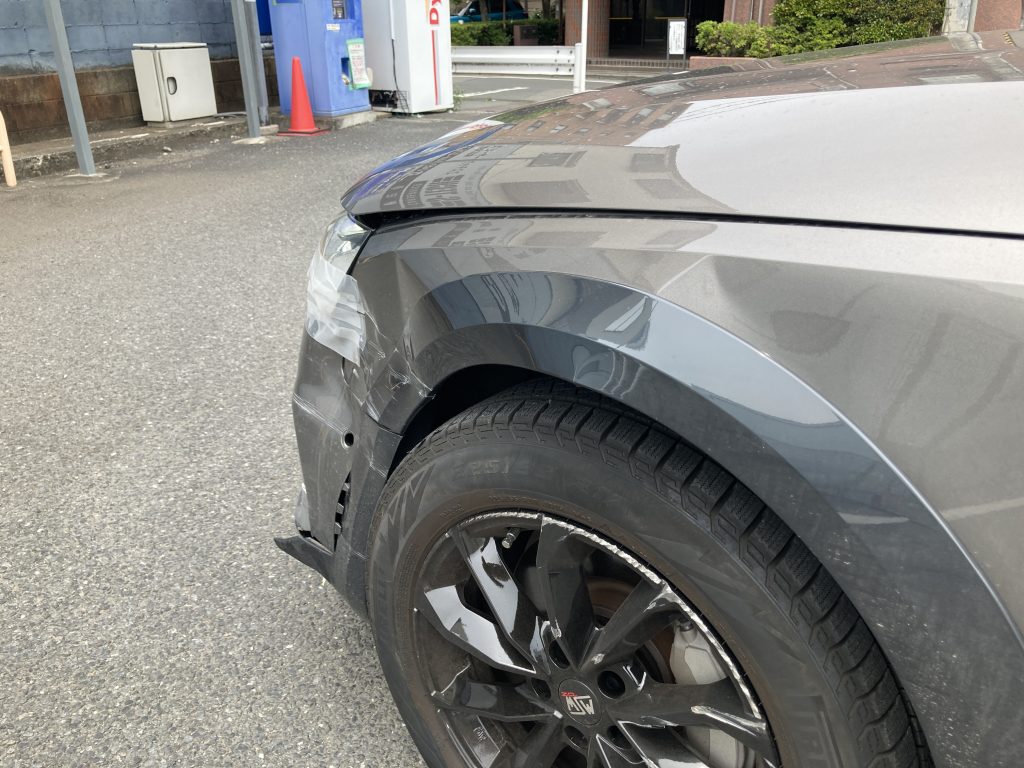 今回の損傷箇所ですが、フロントバンパーの左角付近をガッツリ接触し、ヘッドライトが割れてフロントフェンダーが接触した事によって凹んで変形していました。