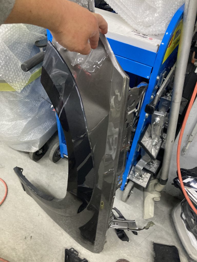 変形したフロントバンパーですが、通常であればフェンダー本体をボディ側にボルトで止める構造になっていることが多いのですが、この車両においてはフェンダーパネルにボディ側に取り付ける為のステーがあり、それぞれがフェンダーを交換するにあたって一緒に交換する部品になります。