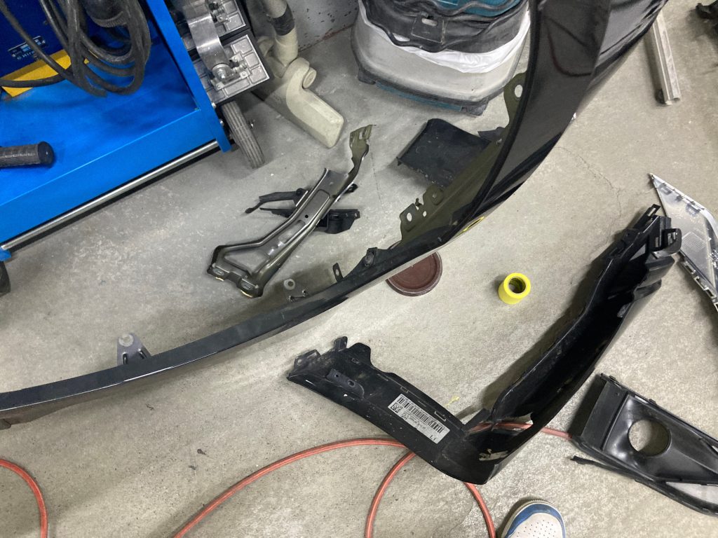 フロントバンパーにおいては、バンパー本体とアーチモールに当たる左スポイラーなどが損傷していましたが、フォグランプが取り付く部分にあるレーダーセンサーは損傷を免れ再使用できる状態でした。