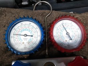 マニホールドゲージにて圧力点検。エアコンガスは十分に入っていますが