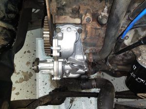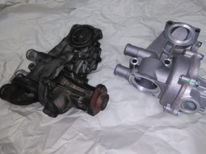 エンジンブロック側はきれいに修正して新しいウォーターポンプを組み付け。