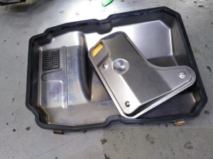 新しいオイルフィルターを組み付けてオイルパンを取り付けます。