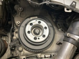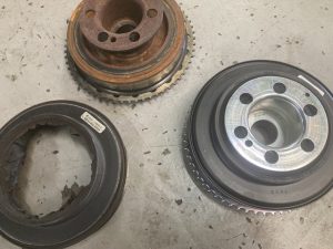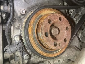 バイブレーションダンパーのゴムが切れてベルト溝部分が脱落してベルト鳴きしてました