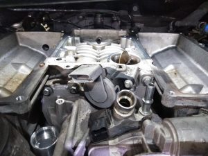 スーパーチャージャー外しVバンクを見ると漏れたクーラントを確認。