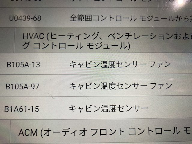 テスターでエラーコードを探るとキャビン温度センサーが現在値で入力されていました。
