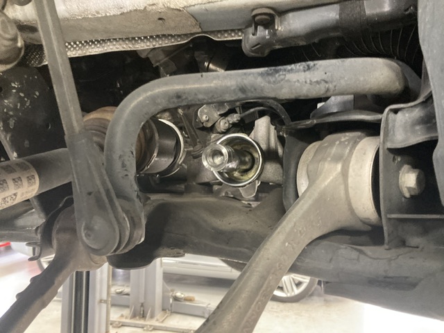 早速リフトアップしてみると、右側のタイロッドという部品が曲がっていました!