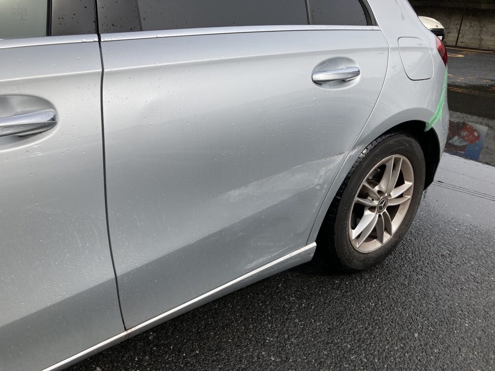 クォーターパネル、キズ、凹み、修理、メルセデスベンツ、W177、Aクラス、リアドア、キズ、凹み、交換、リアバンパー、キズ、変形、交換、ロッカーカバー、キズ、変形、交換、