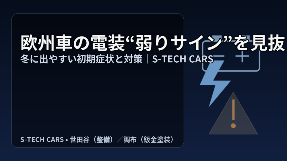 こんにちは、S-TECH CARS(エステック)です。気温が下がると、バッテリーの実力(容量)が一気に低下し、灯火・センサー・各制御の不調が“顔を出し”やすくなります。ここでは、初期症状の見分け方とやるべき対処/やらない方がいいことを、欧州車目線でまとめました。